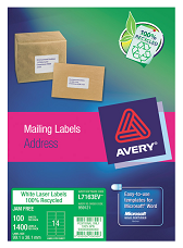 Avery White Laser Labels 100% Recycled Made from 100% environmentally friendly recycled material. Water soluble adhesive. Recyclable. Made in Australia. 100 sheets per box.